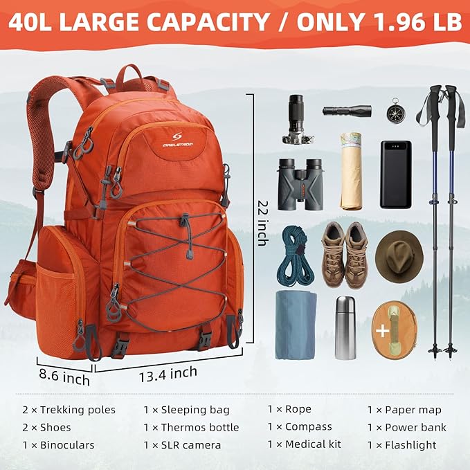 - Spacious And Organized Storage Space: The large capacity hiking backpack measures about 13.4*8.6*22" (W*H*D), capacity: 40 liters. lightweight backpack is equipped with a spacious backpack with zippered main compartment, 2 front zippered pockets, 2 waist zippered pockets, 2 side pockets and 2 mesh pockets, which can efficiently store and categorize different items