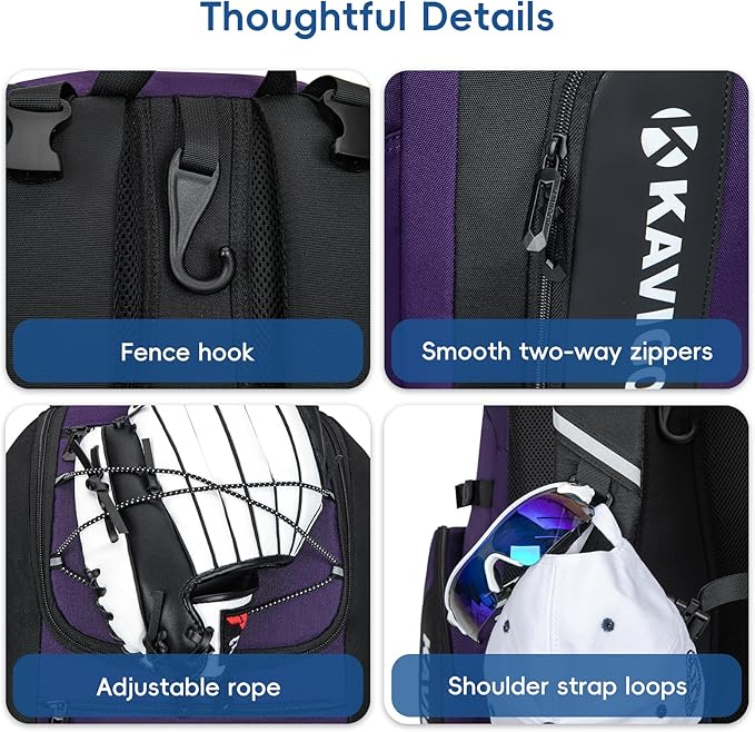 - Durable Materials: Made from tear-resistant 900D Oxford cloth with sponge padding, this adult baseball backpack is built to last and is waterproof. The custom KAVIGOR zippers are thoroughly tested to ensure long-lasting reliability