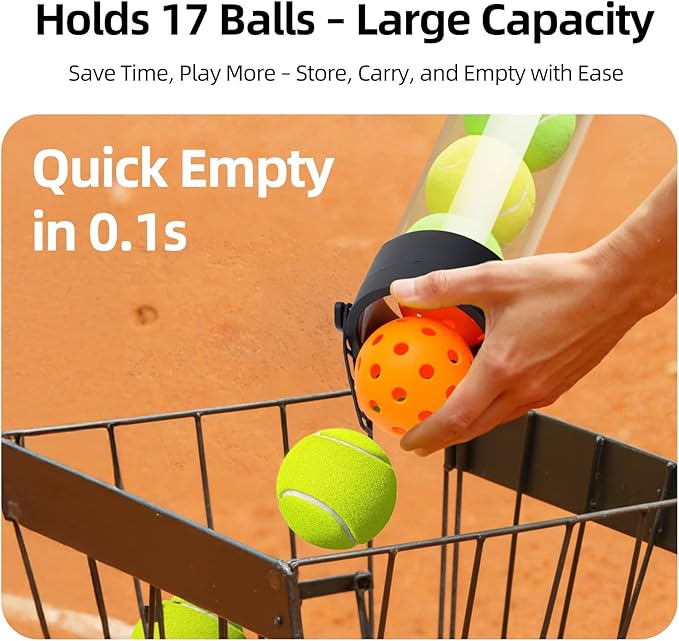 - 【Large Capacity for Continuous Play】 – Holds up to 17 pickleballs or tennis balls in one go, ensuring fewer interruptions during training or games. Ideal for players, coaches, and anyone looking to maximize their time on the court