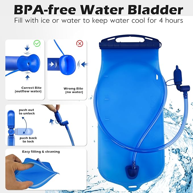 - 【Leak-proof and Explosion-proof Water Bladder】: This 2.0L waterproof water bag is made of PEVA material and does not contain BPA. It has passed the 24-hour air pressure swing test and 24-hour vibration test, completely pressure-proof and leak-proof. It is equipped with a high-flow bite valve and a 360° rotatable nozzle for convenient drinking, will not drip when locked. The large opening is easy to clean and add ice cubes.