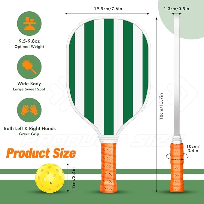 - 【Professional Pickleball Paddles and Balls】The wide pickleball racket area provides more sweet spots for the perfect shot. The dimensions of the pickleball paddles are 15.7" L x 7.6'' W x 0.42''H, and the size of our paddle ball is strictly in accordance with the game standard. They are made for indoor or outdoor play with included two outdoor and two indoor balls