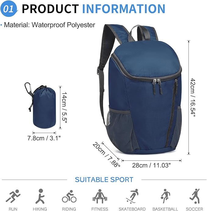 - Ultra Lightweight -- Weighing only 0.16 kg and size (HxLxW)16.54 x 11.03 x 7.88 inch / 42 x 28 x 20 cm, this hiking daypack is perfect for minimalist travelers and outdoor enthusiasts. It folds down to wallet-size (HxL:5.5 x 3.1 inch / 14 x 7.8 cm), making it easy to slip into your pocket or bag when not in use. A perfect companion for hiking, travel, or commuting.