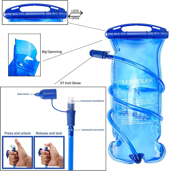 - The hydration backpack comes with a BPA-free 2L water bladder made of food-grade PEVA material. The bite valve locks securely to prevent leaks, ensuring fast water flow without dripping. Ideal for long-distance hiking, climbing, or trail running, this water pack for hiking keeps you hydrated on the go