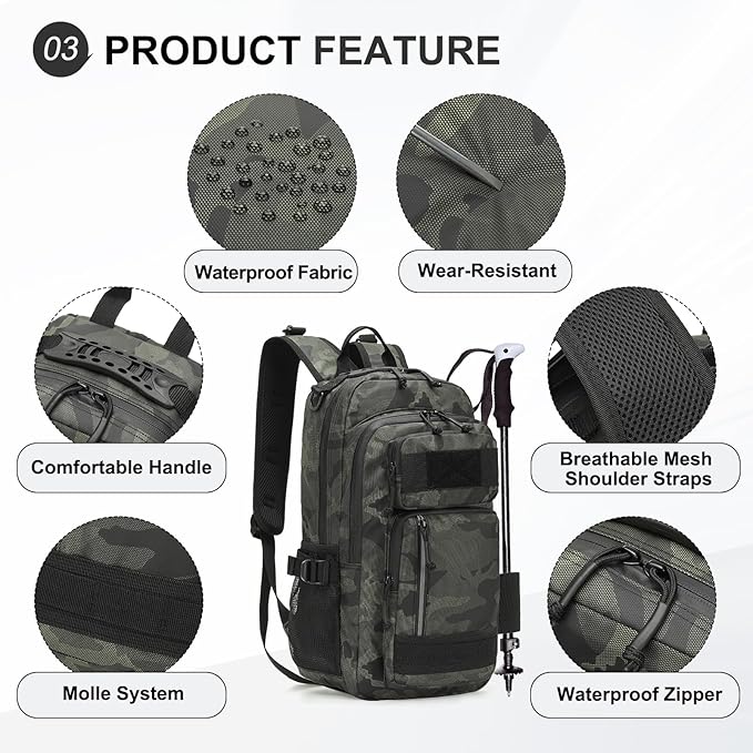 35L Fishing Backpack with Rod Holder, Waterproof Tackle Sling Crossbody Bag with Multi Pocket for Fishing Camping Hunting Hiking, Army Green Camouflage