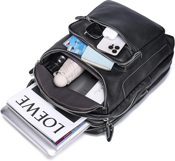 - 【Large Capacity】 3x main compartments, 2x front zipper pockets, interior zipper pockets, 3x card slots, 1x laptop sleeve for 16" laptop, 1x tablet sleeve for 12.9" iPad, adjustable shoulder straps, zipper closure.The Leather backpack offers large-capacity, but brings together covenience and functionality.
