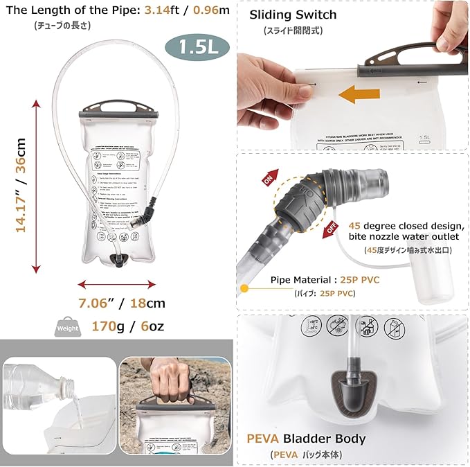 - Hydration Bladder: Includes a 1.5L BPA-free PEVA bladder weighing only 6 oz (170 g). Designed with pressure resistance and leak-proof performance to keep you hydrated on hikes, cycling, running, and other outdoor adventures