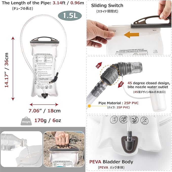 - Hydration Bladder: Includes a 1.5L BPA-free PEVA bladder weighing only 6 oz (170 g). Designed with pressure resistance and leak-proof performance to keep you hydrated on hikes, cycling, running, and other outdoor adventures