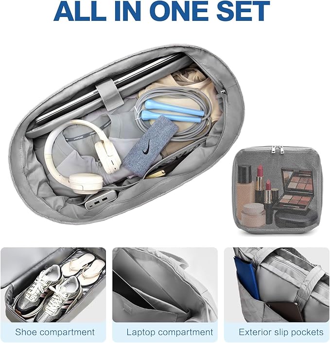 Weekender Bag for Women Men, Large Overnight Bag Faux Leather Travel Duffel Bag with Shoe Compartment Toiletry Packing Cube Carry On Bag Fit 21" Laptop 3Pcs Set (2PCS Grey)