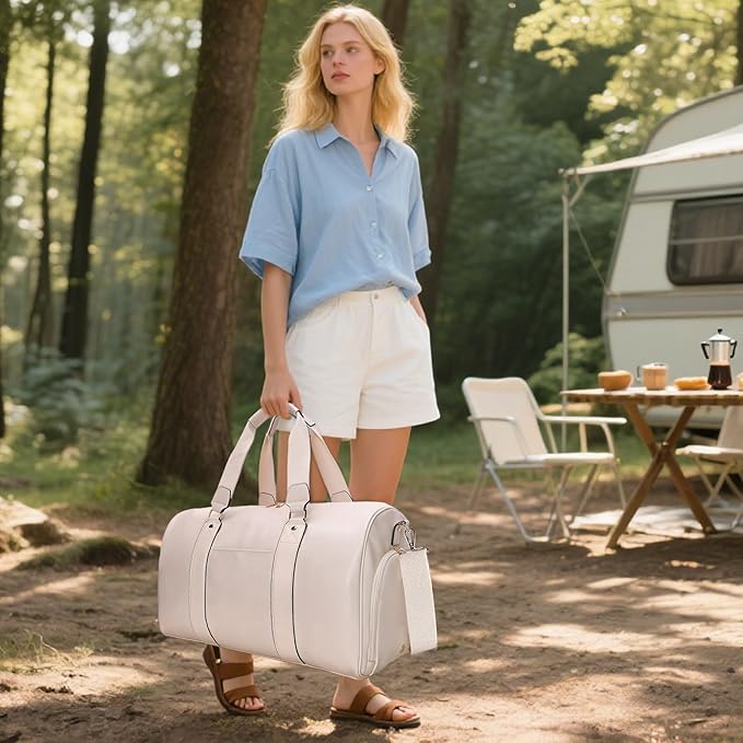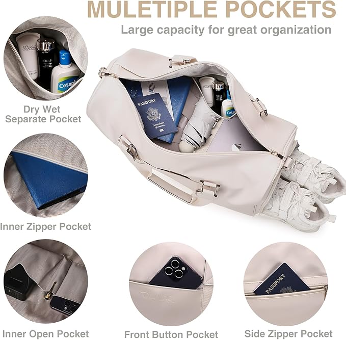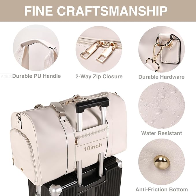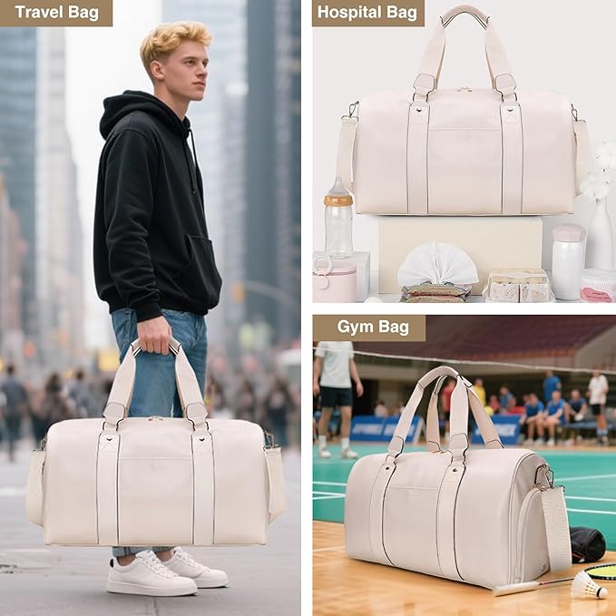 3-in-1 Leather Duffle Bag with Toiletry and Shoe Compartment, Weekender Overnight Gym Bag for Men and Women, Carry On Fits Most 15.6 Inch Laptops(Beige)