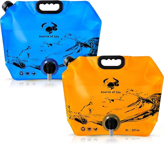 Collapsible 8L Water Storage Bag, BPA-Free Portable Folding Water Jug with Adjustable Faucet, Leakproof Emergency Water Bag for Camping, Hiking, Riding, Outdoor Sport (2, Blue & Orange)