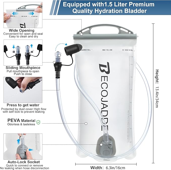 - Becojadde hydropack has three sizes to meet your daily lifestyle choices: ①Only 5L running vest, ②5L Hydration vest with two 500ML Soft Water Bottles, ③5L Running backpack with one 1.5L Water Bag. For your comfort, please consider your daily usage when selecting the right size.