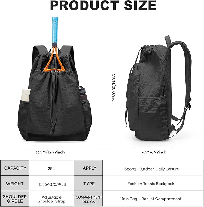- 【Durable & Adjustable Polyester Build】Crafted with stain-resistant polyester (12.99" x 6.99" base) and a drawstring top for flexible storage. This tennis racket bag withstands daily wear – ideal for gym, travel, or weather changes