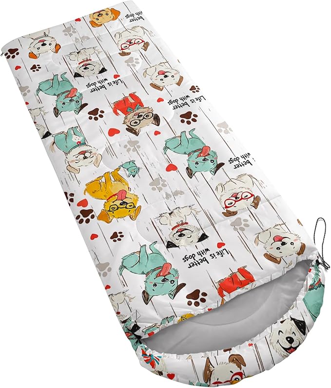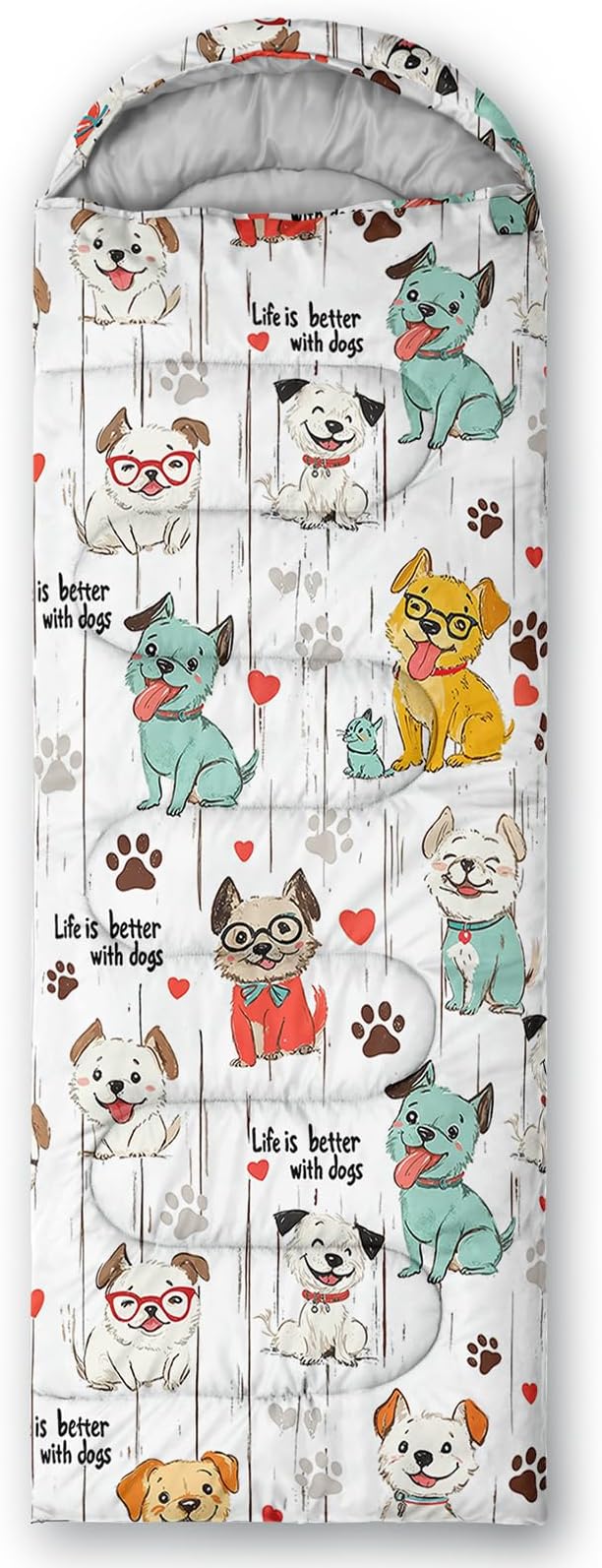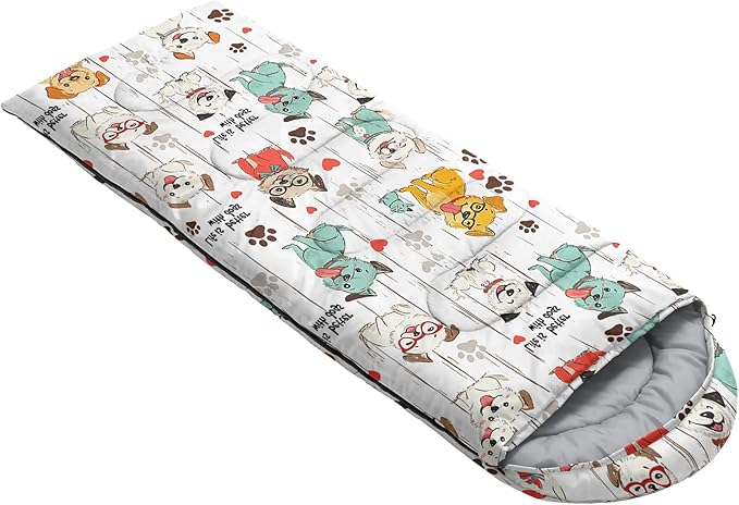 - 【Fits For 3 Seasons】: Size - 31 by 90 inches (W x D). Our cute puppy dog sleeping bag can be used in 3 seasons with a design temperature of 32℉-77℉(0℃-25℃). These Sleeping bags also have a weather resistant waterproof design to keep you warm and prevent you from any dampness.