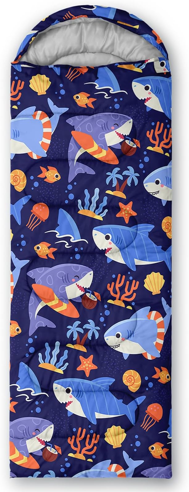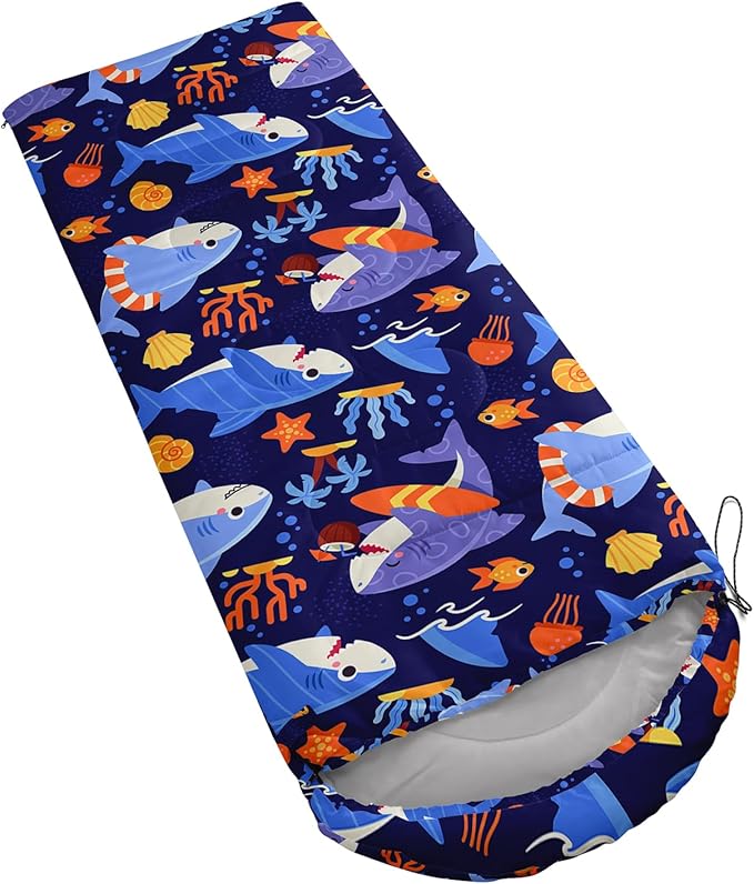 - 【Fits For 3 Seasons】: Size - 31 by 90 inches (W x D). Our cartoon shark sleeping bag can be used in 3 seasons with a design temperature of 32℉-77℉(0℃-25℃). These Sleeping bags also have a weather resistant waterproof design to keep you warm and prevent you from any dampness.