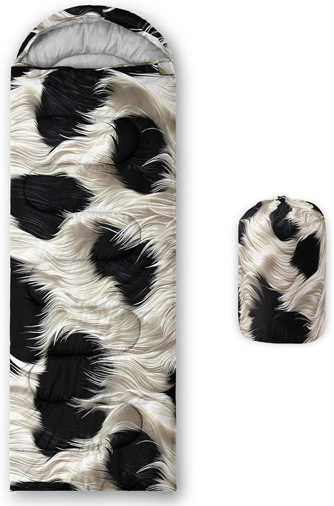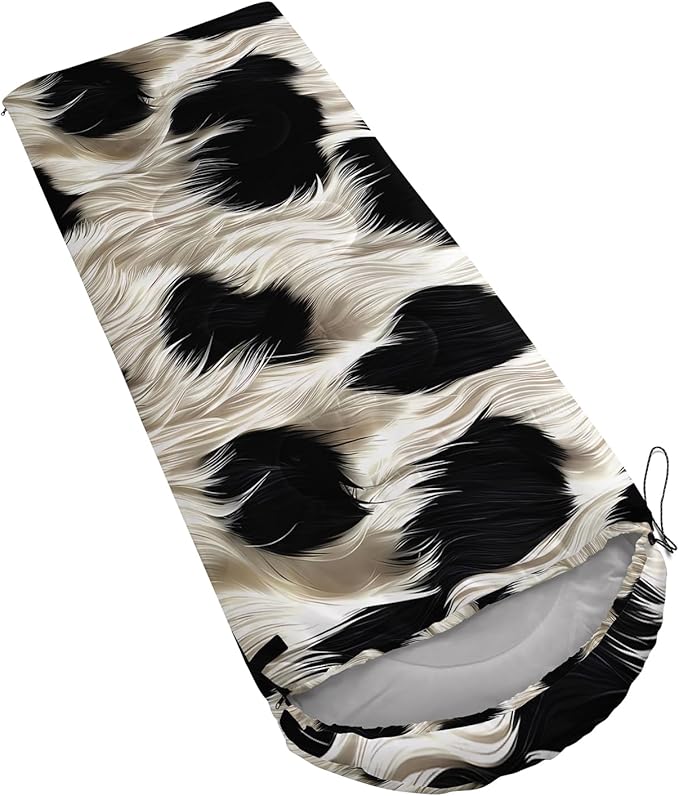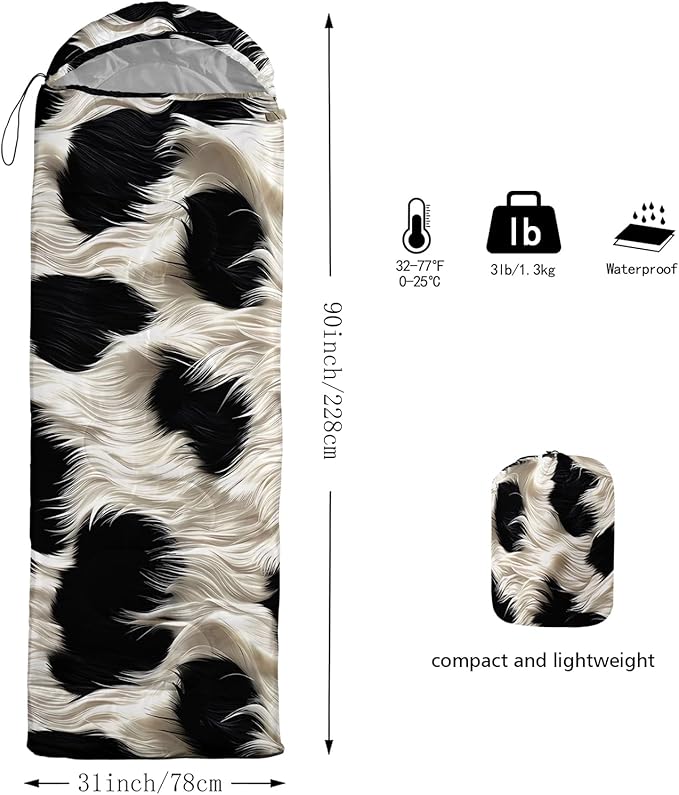 - 【Fits For 3 Seasons】: Size - 31 by 90 inches (W x D). Our cow print sleeping bag can be used in 3 seasons with a design temperature of 32℉-77℉(0℃-25℃). These Sleeping bags also have a weather resistant waterproof design to keep you warm and prevent you from any dampness.