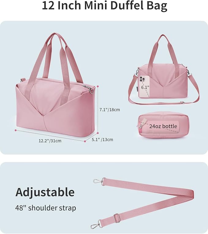 - 【Smart Storage】This 12.2" mini gym bag for women features a dedicated wet pocket (EVA-lined) and 2 internal mesh pouches to organize toiletries, clothes, bottles, phone, and more. Everything has its place—no mess, no mix-ups.