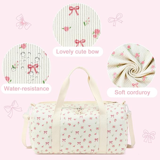 - 【Compact Sports Duffel Bag】: Size: 18.1L x 8.7W x 9.1H inches, Capacity 23L, roomy space with plenty of pockets, it's a full sized kids duffle bag, fits most gym/club locker perfectly. The pink bow duffle bag is made of waterproof polyester, lightweight, sturdy, breathable and tear-resistant. Comfortable and allowing you to set them to your desired length