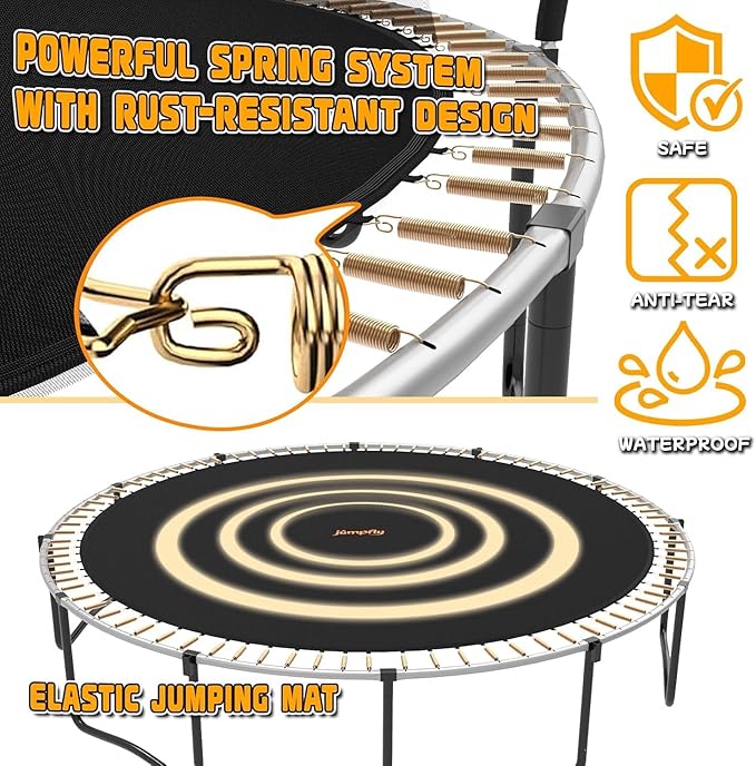 - Timeless fun starts here: Our double-galvanized sturdy steel frame withstands harsh weather, resisting rust and corrosion. Paired with premium UV-resistant materials, your trampoline stays newer for longer. Just like you, we want those happy moments to last.