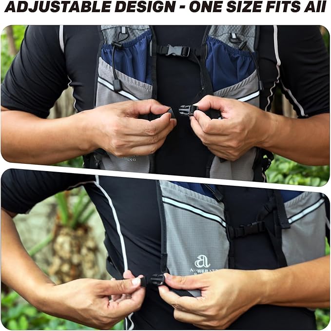 - Organized & Safe for Night Runs Stay organized and visible with this versatile running vest. It includes a dedicated hydration bladder compartment, multiple zippered pockets for gear and nutrition, and 3M reflective strips for low-light safety. Secure strap clips manage excess webbing, ensuring a clean and safe run any time of day.