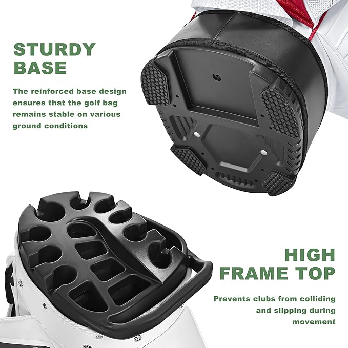 - 14-Way Full-Length Dividers + Putter Well:This golf cart bag features 14 separate compartments with a dedicated putter slot for full protection against impact damage. The putter hole cannot be used when clubs are full, and is suitable for up to 14 clubs at a time