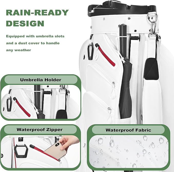 - Extra Large Storage Space:Crafted from premium water-resistant and durable leather, these pockets offer both style and luxury. The spacious pockets easily accommodate clothing, shoes, gloves, and other essentials. Includes a dedicated rain cover for full protection, ensuring your clubs and equipment stay dry in wet conditions