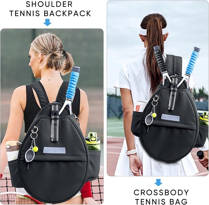 Tennis Backpack with 2 Rackets Holder, Water-Resistant PU Leather Tennis Racket Bag for Women & Men, Sling Crossbody Sports Backpack for Tennis, Pickleball & Badminton, Tennis Gifts