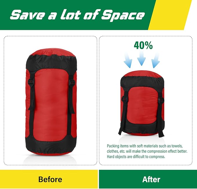 - Made Travel Easier on the Move: waterproof compression sack is equipped with 2 strong compression straps and 2 quick release buckle straps, designed to make your trip more convenient and more organized; Compress your stuff easily and efficiently, space saving, no more bulky, messy luggage, which takes up minimal space in your backpack. Please note: Our products can compress items with soft materials, such as towels, clothes, etc. Hard items are difficult to compress, such as cups, etc