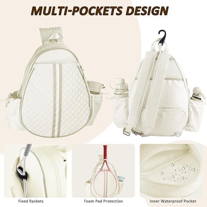 Tennis Racket Bag, Tennis Bags for Women, Quilted Sling Crossbody Backpack with Hook, Water Resistant Tennis Racket Cover for Pickleball, Racketball