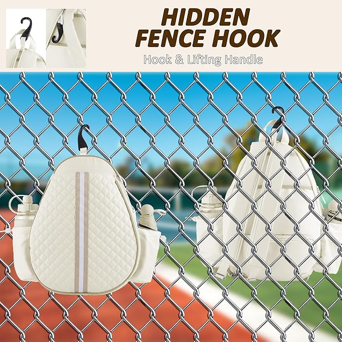 - Innovative Fence Hook Feature - A heavy-duty fence hook attaches securely to court barriers, keeping your tennis bag off dirty ground and within arm's reach. Easily grab wristbands, tape, or snacks without bending down, while the retractable hook ensures no snags when stored