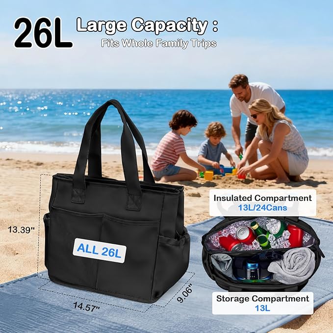 - Spacious 26L Capacity for Whole Family:With a spacious 26L total capacity, this large soft cooler bag is perfect for family trips. Store towels, clothes, and gear in the dry section, while keeping all your food and drinks chilled in the insulated compartment. It’s the ideal soft sided portable cooler for beach days, picnics, and camping.