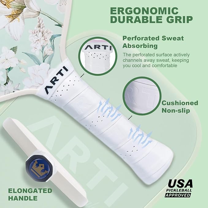 - Professional Specifications: USAPA-approved paddles with a weight of 7.8–8.0 oz, length of 16.5 inches, width of 8 inches, and a comfortable 5-inch ergonomic handle. The 4.25-inch grip fits naturally in your hand, providing an anti-slip, breathable hold for superior control and enhanced spin on serves
