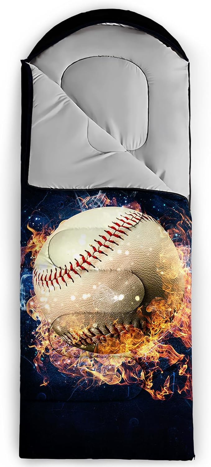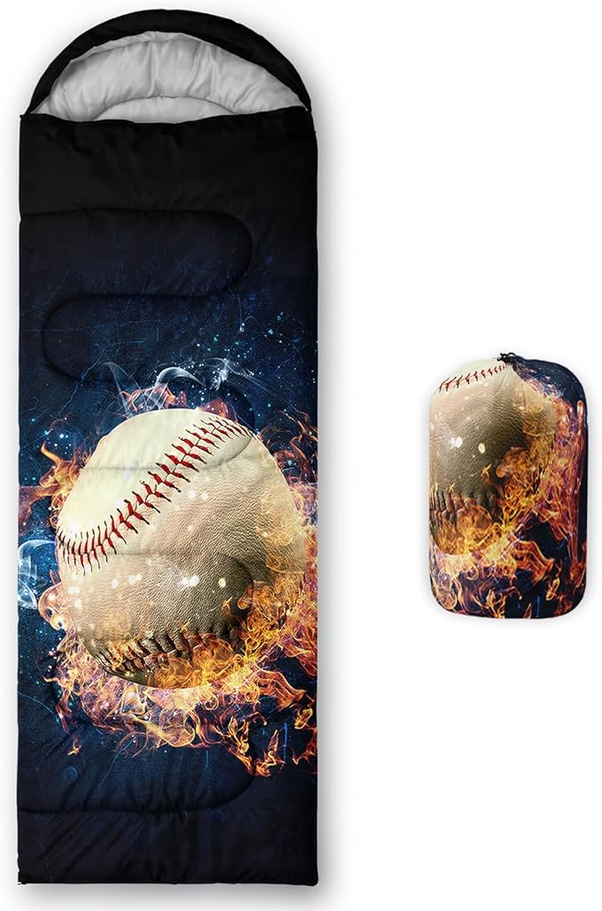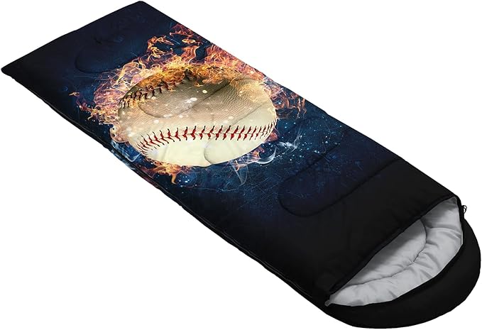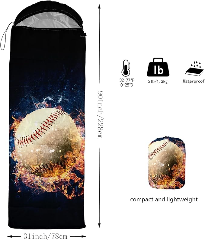 - 【Fits For 3 Seasons】: Size - 31 by 90 inches (W x D). Our baseball print sleeping bag can be used in 3 seasons with a design temperature of 32℉-77℉(0℃-25℃). These Sleeping bags also have a weather resistant waterproof design to keep you warm and prevent you from any dampness.