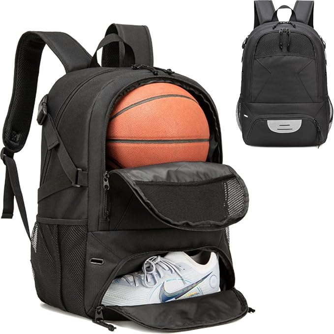 - More Space Than Ever Before: RTRYALN basketball bag backpack can easily carry your basketball equipment. Equipped with many storage compartments basketball backpack: 1 special compartment for your basketball, 1 main compartment for your clothes, 1 breathable compartment for your basketball shoes, 2 side mesh pockets for your water bottle, towel, first aid tools, air pump and other equipment.