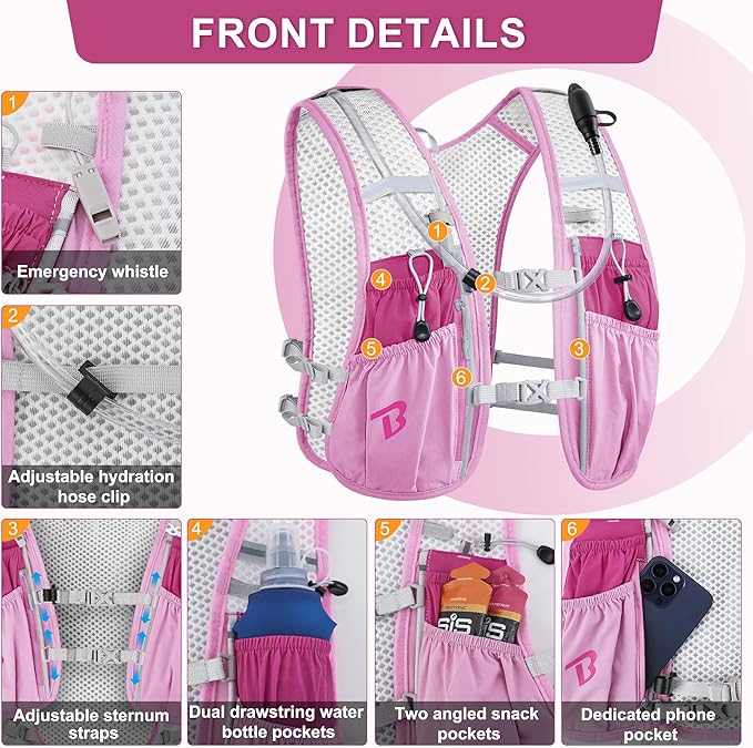 - Smart Storage Layout: hydration water vest with Multi-pocket design features a waterproof phone pocket + dual rear zippered compartments for clothes. Extra space organizes snacks, keys & gear.