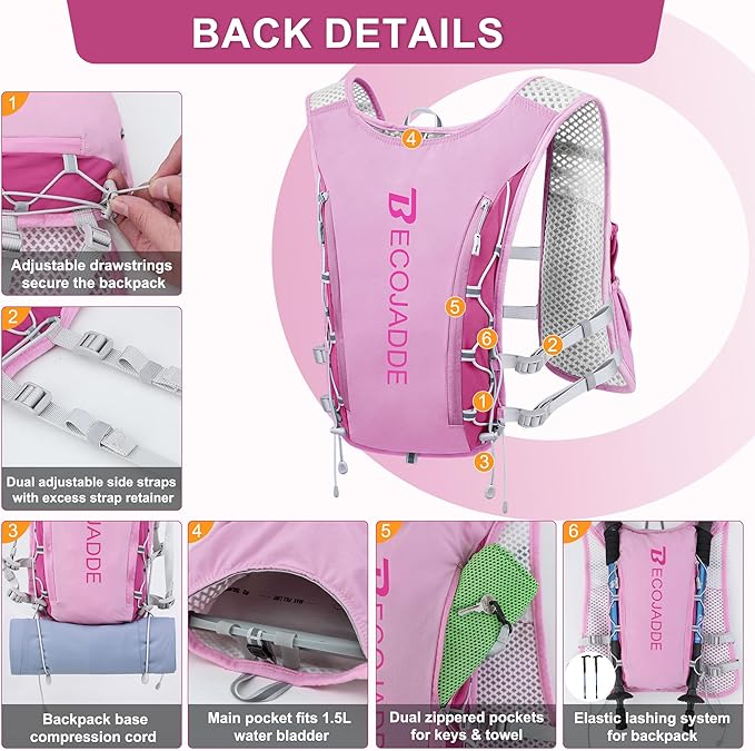 BECOJADDE Running Vest Hydration Backpack for Men Women, 5L Lightweight Running Backpack Hydration Pack for Marathon, Trail, Cycling, Hiking, Jogging
