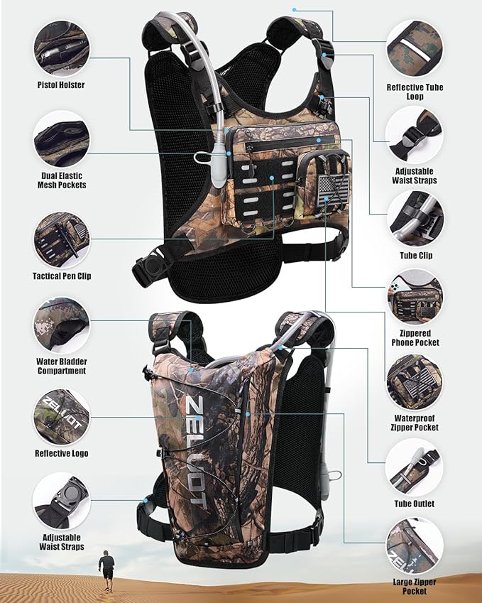 - Plenty of Storage - This chest bag features 3 waterproof zippered front pockets to securely hold essentials like your phone, keys, and energy gels. A detachable, bounce-free pistol holster ensures secure storage for small to mid-sized pistols, while the tactical pen slot keeps emergency gadgets within easy reach. Two large back pockets fit a water bladder, towel, extra clothing.