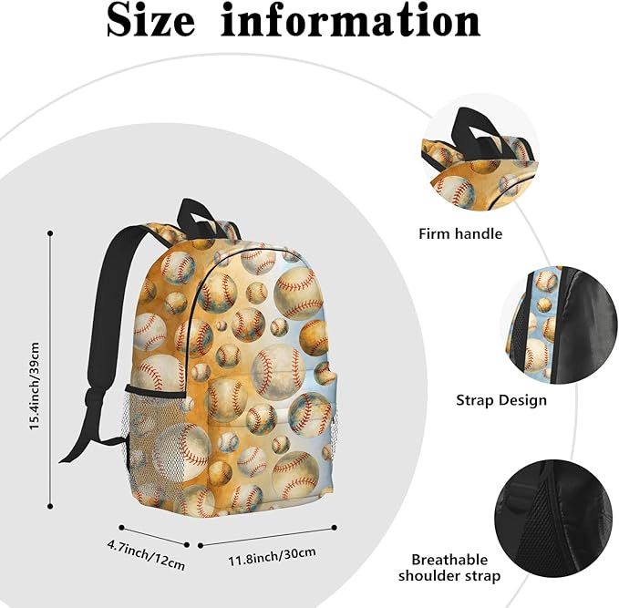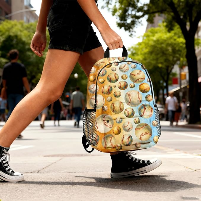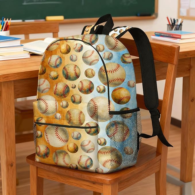 Baseball Backpack for Kids & Youth, 16 Inch Tennis-Themed School Bookbag, Lightweight Polyester Daypack with Front Zip Pocket, Side Bottle Pocket, Padded Adjustable Straps, Unisex
