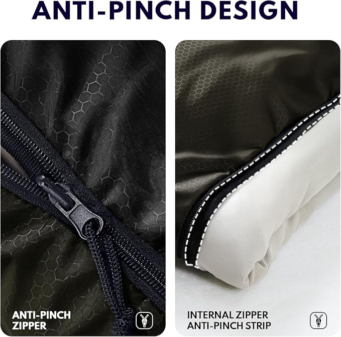 - 【HIGH QUALITY ACCESSORIES】Two-way zipper with “zipper guard” to prevent stuck hooks effectively.Polyester shell, durable and long-lasting.The windbreak strip of the zipper prevents heat from escaping through the gaps of the zipper.Sleeping bag inner big pocket, 5.3 by 7.5 inches (W x D), easy to store your personal belongings