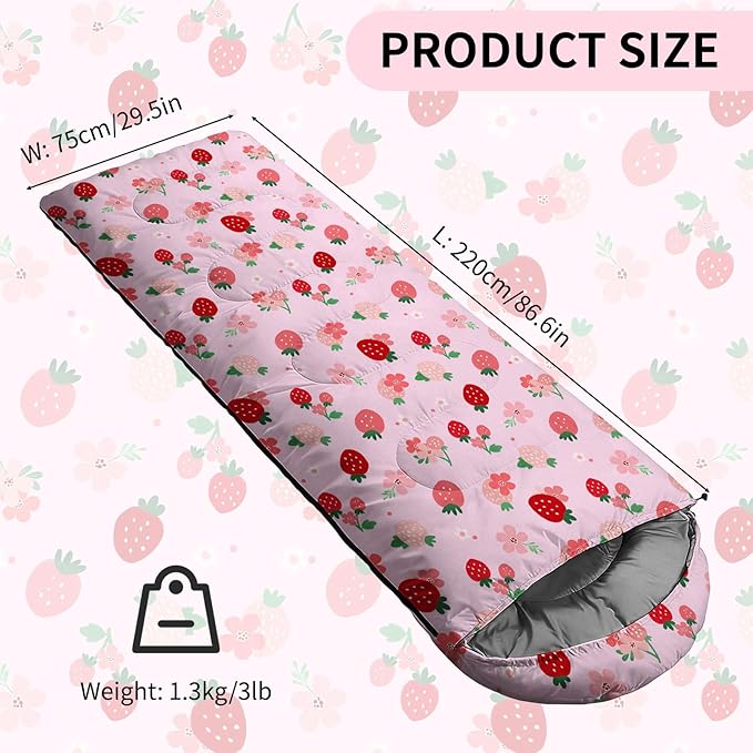 - Product Design: This sleeping bag is made of ultra-lightweight material with smooth, flowing zippers, excellent breathability, and colorfastness. The strawberry pattern design ensures vibrant and long-lasting colors. Suitable for spring, summer, autumn, and cool weather, it provides superior warmth for your camping trips.