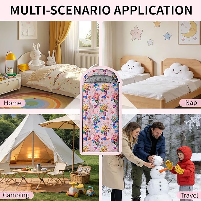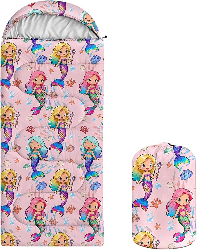 - Product Design: This sleeping bag is made of ultra-lightweight material with smooth, flowing zippers, excellent breathability, and colorfastness. The mermaids pattern design ensures vibrant and long-lasting colors. Suitable for spring, summer, autumn, and cool weather, it provides superior warmth for your camping trips.