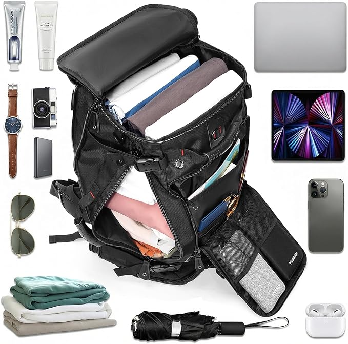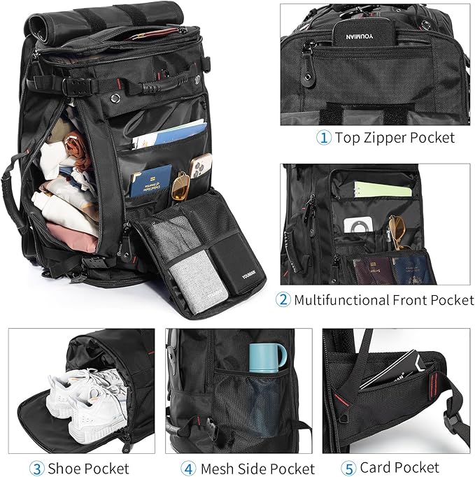 YOUMIAN Large Capacity For Travel Hiking Sports Carry On Backpack Durable Convertible Duffle Bag Laptop airplane (Black, 60L-Large DualMainOpening)