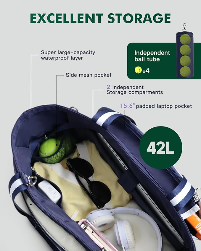 - [Spacious &Durable Construction]Featuring a generous 42L capacity, this versatile tennis bag easily holds all your sports gear and daily essentials. The combination of ample space and wear-resistant materials delivers a comfortable, high-quality experience perfect for active lifestyles. It's not just a tennis racket bag; the external reinforced ball pocket and internal mesh compartment allow for convenient storage of multiple balls, making organization effortless (Dimensions: 18×14.5×7 inches | Weight: 2 lbs).